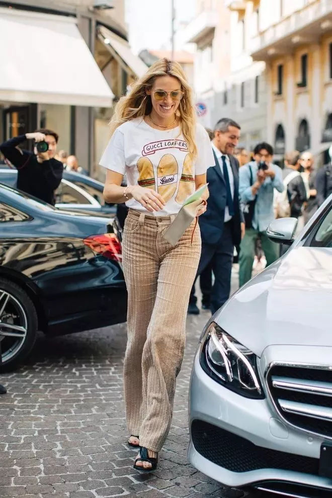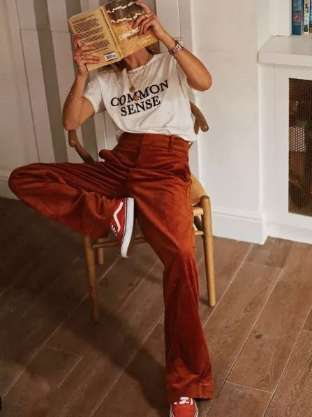 搭完针织衫的灯芯绒阔腿裤,别急着收啊!接着搭配T恤依旧风度不减当年,时髦依旧!