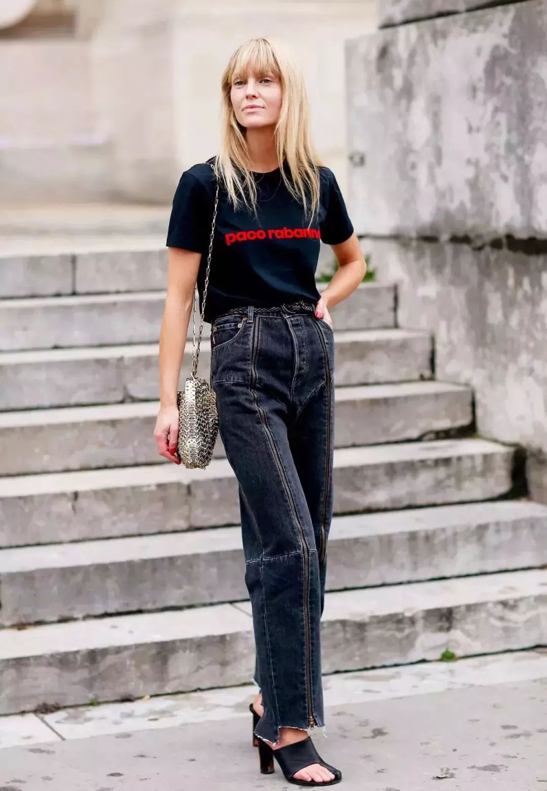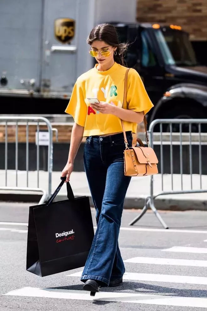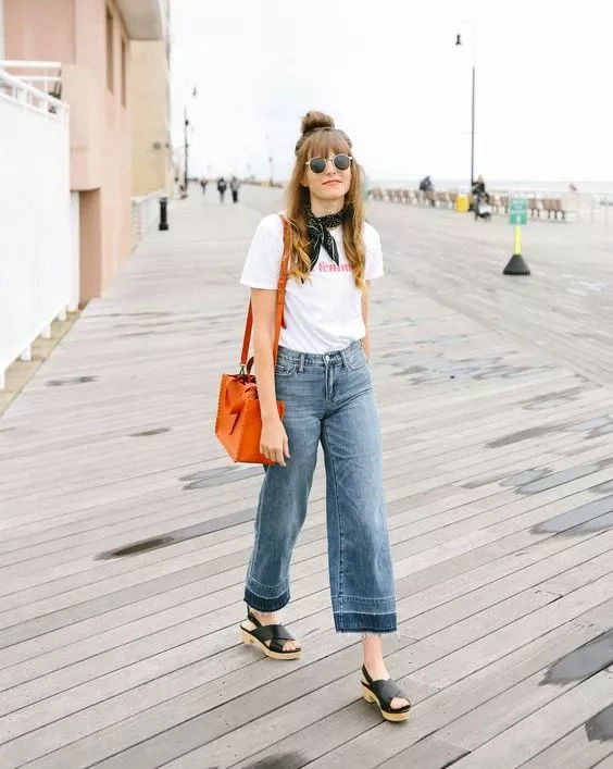 日常纯色T恤+牛仔阔腿裤,在裤子动动手脚更显时髦,选择纸袋阔腿裤或是将裤脚折边穿,更能提升时装感,搭配尖头高跟鞋,清爽又干练脱颖而出!