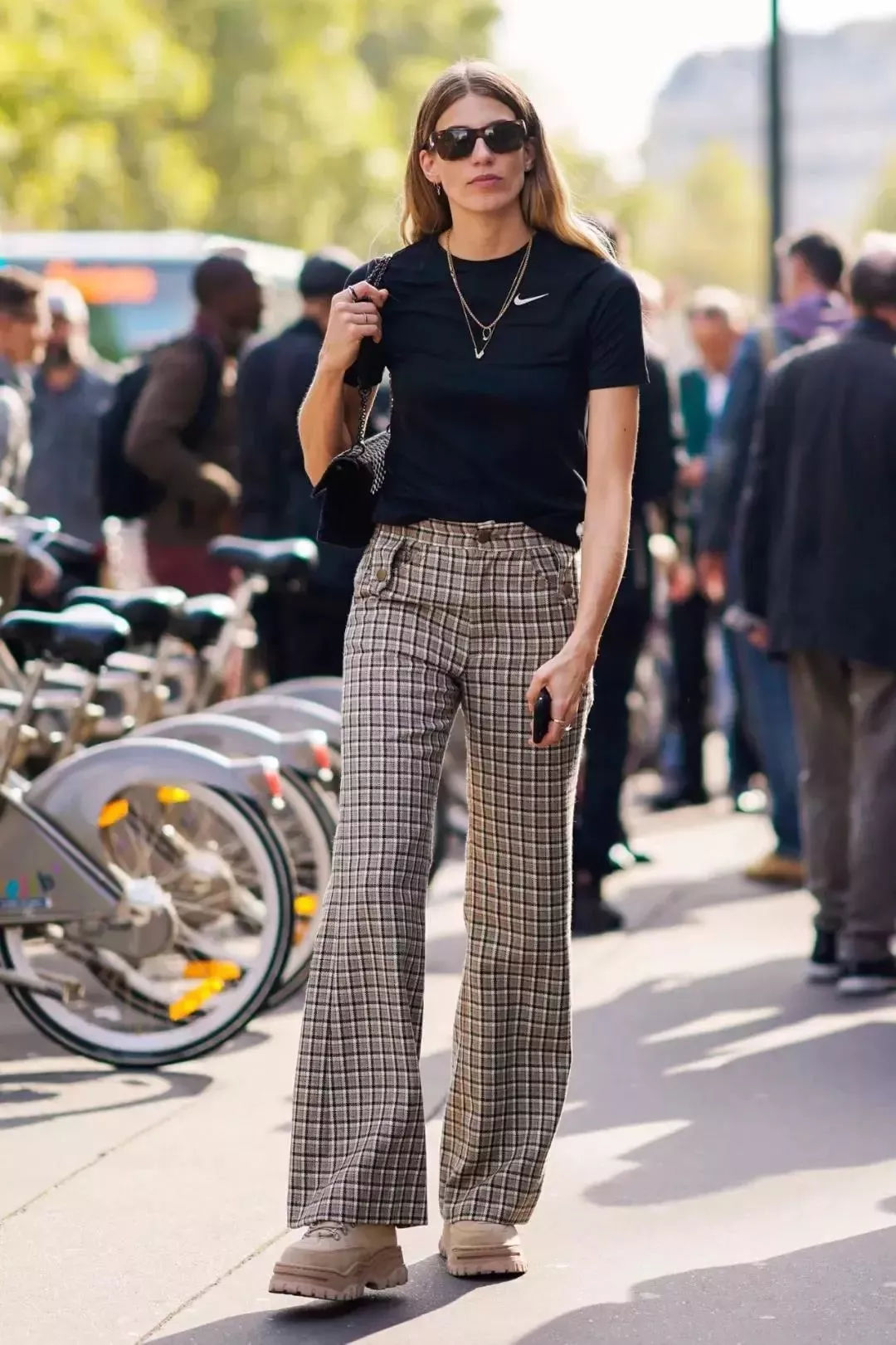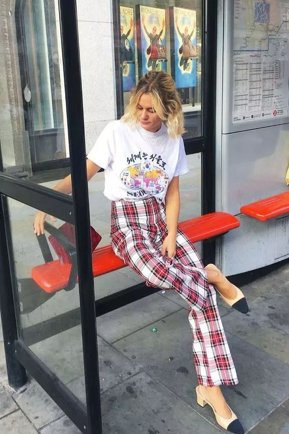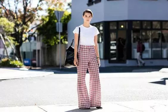 谁说笨重的鞋子就一定土俗!搭配格纹阔腿裤+T恤,九分裤显高又时髦,老爹鞋让整个lOOK提升一个Level,同样是穿T恤+阔腿裤,这么穿你总能比别人更时髦!