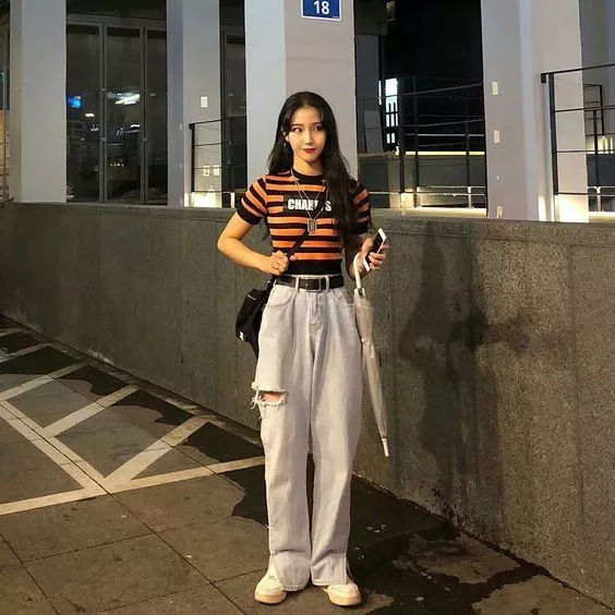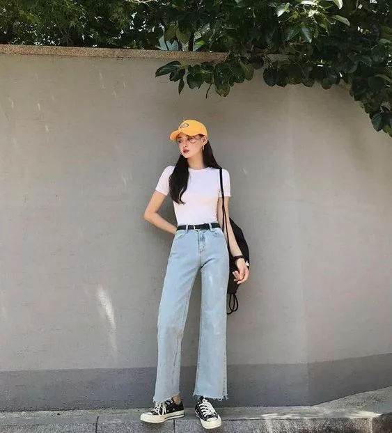 时髦精选择牛仔阔腿裤+纯色Tee,舒适又减龄,尤其对于小个子妹子,九分裤露脚踝绝对占据了显高显瘦的俩大优势。运动系女孩儿选择老爹鞋或是帆布鞋呼应整体,个性十足又舒适减龄!