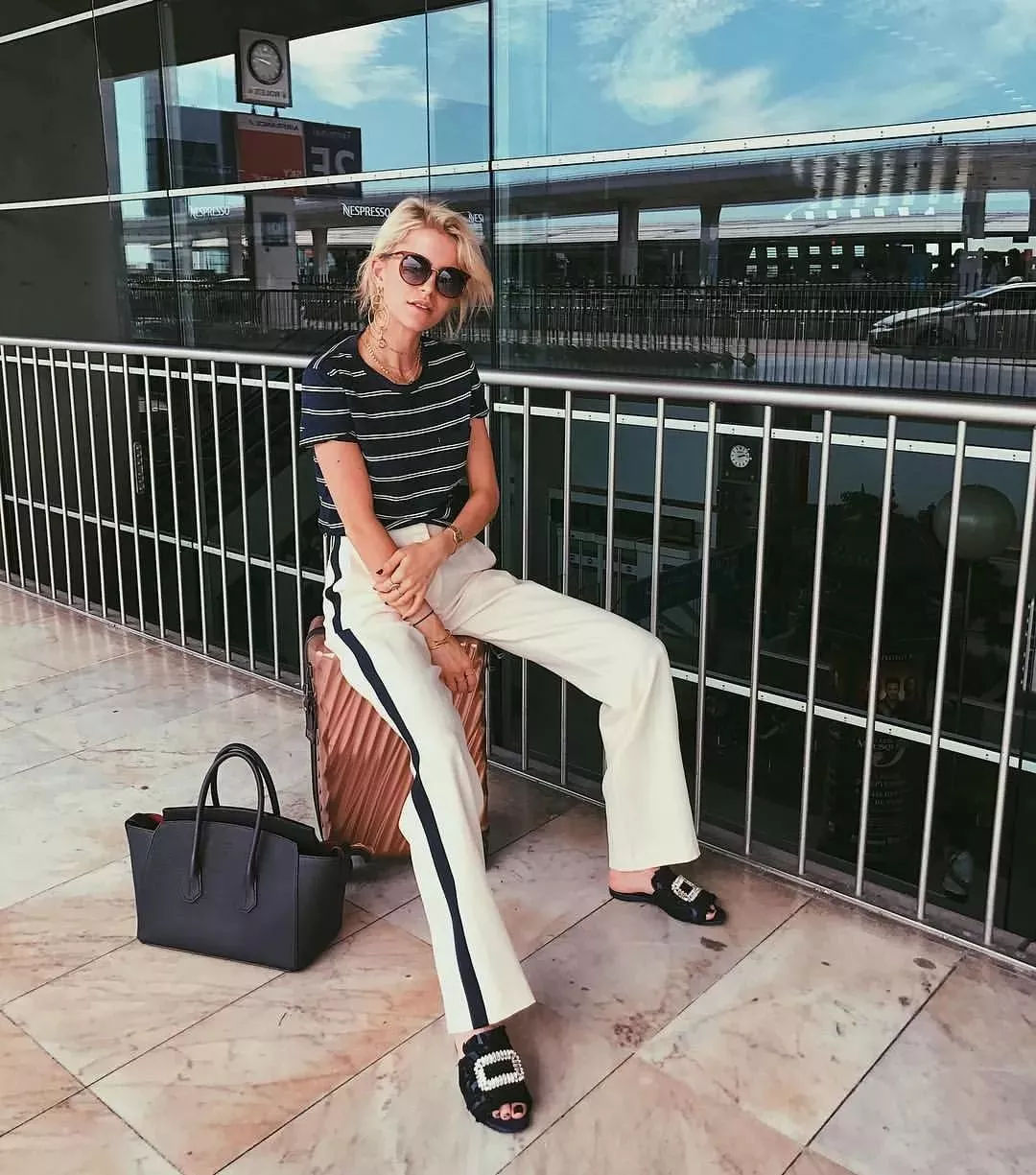 条纹阔腿裤视觉上更显腿长!搭配T恤时有了尖头高跟鞋加持!不经意之间多了一份随性和休闲感,又不失女人味!