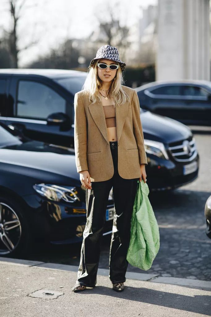 今年,她街拍中的包包更发随意,已经出现了布袋子的身影。