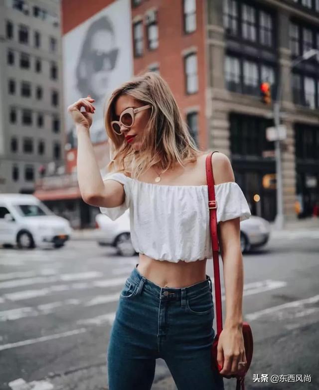 上身较瘦的妹纸们可以选择一字领的短上衣,时髦又性感。