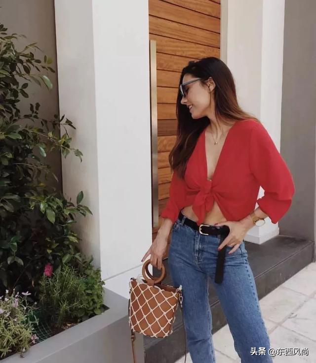 红色的长袖短上衣搭配深蓝色牛仔裙,有种复古港风的感觉,今年简直流行到爆炸!
