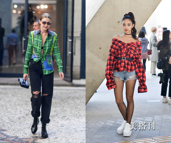 格纹衬衫系下面的纽扣也是一种与众不同的穿法,像超模吉吉这样,绿色格纹衬衫只系下面一粒扣,配黑色破洞牛仔裤,很是性感不羁。除了之外,还可以将格纹衬衫打造成露肩造型,搭配皮腰带,性感不臃肿。