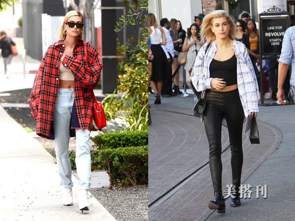 说起格纹衬衫当外套穿,今年很多时髦精都喜欢,对于欧美潮人更喜欢将敞开的格纹衬衫搭配紧身运动内衣穿,像海莉就不止一次的穿过格纹衬衫+内衣的造型,红色格纹衬衫配白色内衣,蓝色格纹衬衫配黑色内衣,都是非常休闲又有女人味。