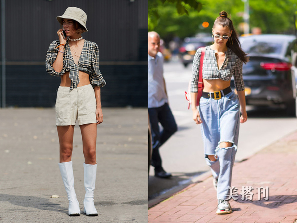 春夏想要秀腹肌的话,可以将格纹衬衫的下摆打造成蝴蝶结样式,蝴蝶结休闲带着甜美,下身配一件白色短裤,无比的凸显好身材。此外,一件短款的格纹衬衫也可以秀腰腹,上V下短,完美身材一览无余。