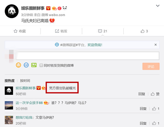 7月26日,网上出现很多爆料文章和马伊琍离婚的消息,文章此前曾出轨姚笛,不过姚笛已经有了未婚夫,两人之间不再有纠缠。其实之前就有娱乐博主发文称其实马伊琍和文章已经是一对貌合神离的假夫妻了,因为文章有过出轨的历史,外界关于两人离婚传言一直都没有断过。