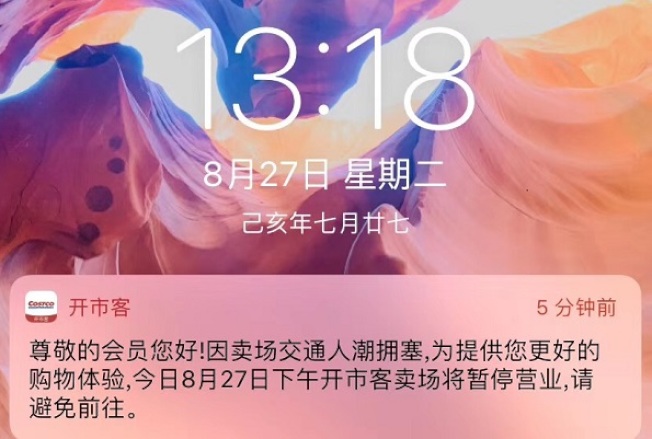 中国首家Costco今天在上海正式开业,上午8点半开门营业半天,人潮汹涌,下午1点紧急在进店门口、Costco APP弹出通知,下午暂停营业。