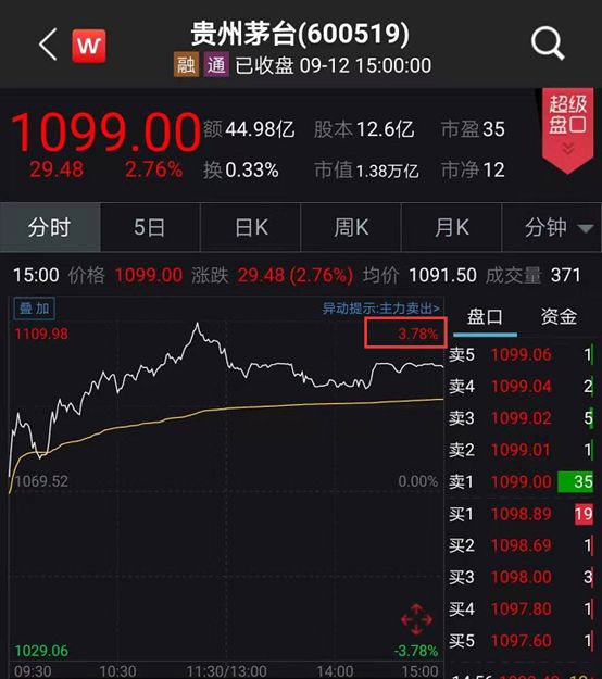 12日,贵州茅台开盘上涨超1.2%,盘中最高涨幅3.78%,几乎要收复昨日的失地。截止收盘,贵州茅台上涨2.76%,报收1099元。