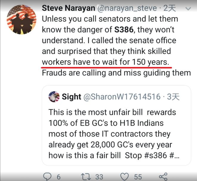 S386法案名为:Fairness for High Skilled Immigrants Act,(高技术移民公平法案),网民因其“偏向”印度绿卡申请者而称之为“排华法案”。