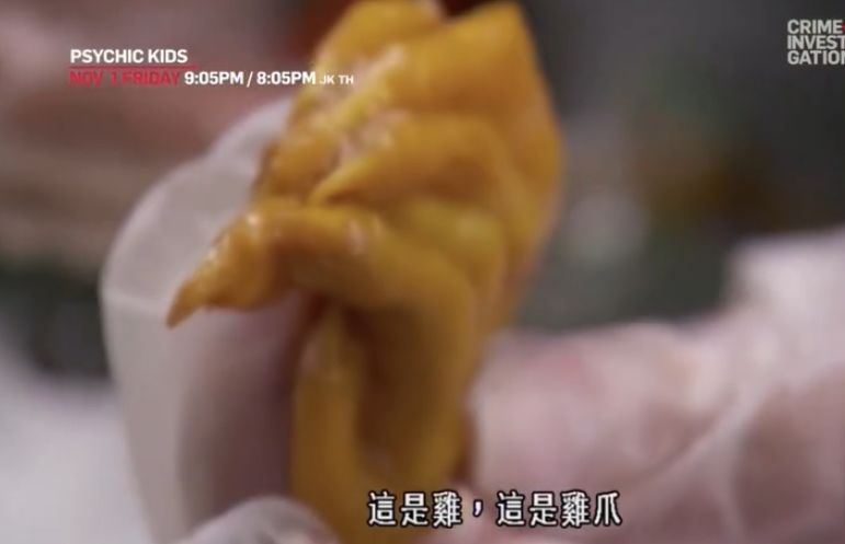 警员拿起一份装有卤鸡爪零食的袋子问这名华人母亲:“这是什么?”