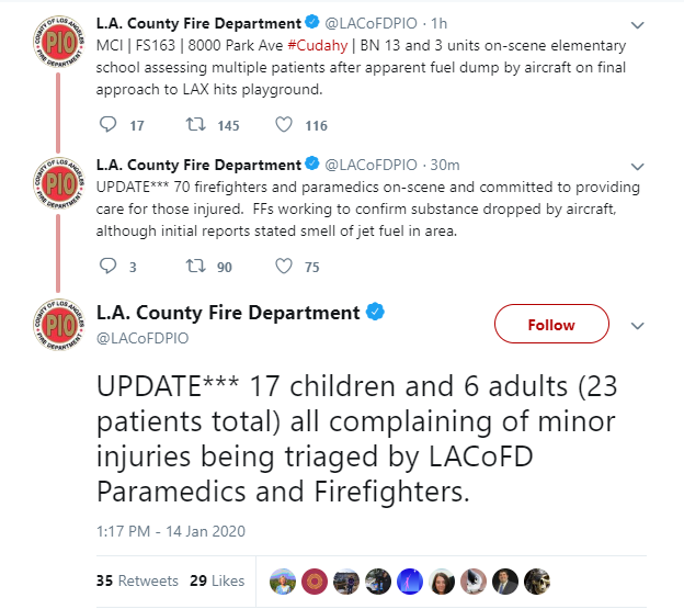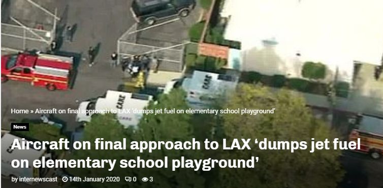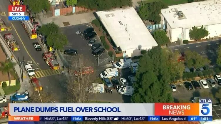 美西当地时间1月14日,结合洛杉矶当地多家媒体报道,今天中午12点30分左右,洛杉矶消防部门在推特上发布消息称,一架接近LAX机场的飞机在一所小学上空倾倒燃油。