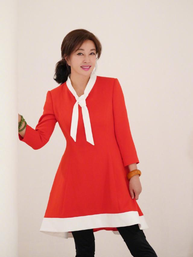想要穿得减龄一点,色彩上选择亮眼一点是比较容易做到的。比如红橙黄绿这些颜色,这里特别推荐大龄女性选择红色单品,这不仅仅是因为显白百搭,还有就是显肤色,让你看上去气色更好。如刘晓庆下图,红色连衣裙搭配个小黑裤,年轻10岁都不止。