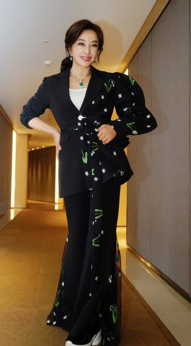 在单品的选择上,裙装无疑是最能展现女性温柔贤淑特性的单品,但如果你穿腻了连衣裙,不妨尝试一下西装裙。西装裙有西装的正式庄严感,又有裙装的温柔洒脱感,两者结合庄重又不失女人味。像刘晓庆下图这身丝绒西装裙,再在裙摆处加入开衩设计,非常有性感的魅惑力。