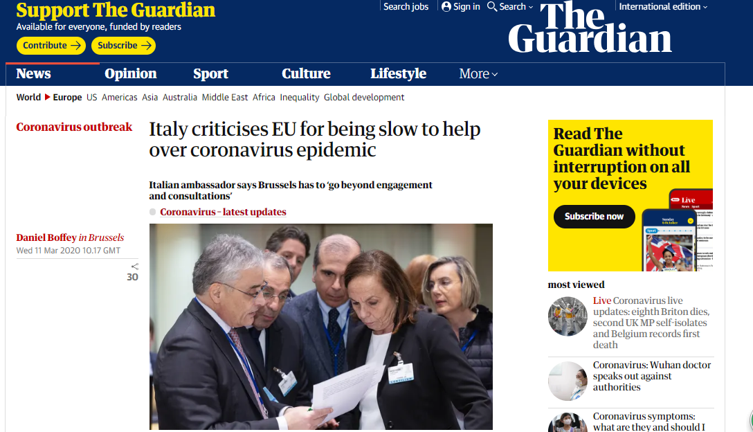 “没有一个欧盟国家响应委员会的号召。只有中国作出了回应。”据英国《卫报》11日报道,意大利驻欧盟大使毛里齐奥·马萨里10日在美国“政客”新闻网欧洲版上发表署名文章,批评欧盟及其成员国在疫情当前为意提供援助速度缓慢,“这并不是欧洲团结的好兆头。”他表示,新冠病毒危机不仅仅是某一个国家的事,它是一场“欧洲危机”。