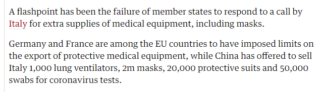 针对马萨里所提到的这点,《卫报》还补充道,德国和法国目前已经限制医疗防护物资的出口,而中国已经提议向意大利出售1000台呼吸机、200万只口罩、20000套防护服及50000套用于新冠病毒检测试剂盒。