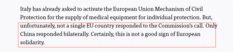 他认为,各国必须在欧盟的协调下,确保必要医疗设备的供应,并将其重新分配给最需要的国家和地区。“今天,这个国家是意大利;但明天,可能就是其他国家。” 在文章中,马萨里接着写道,意大利已经要求启动欧盟的民事保护机制,以确保个人保护所需的医疗装备供应,“但不幸的是,没有一个欧盟国家响应委员会的号召。只有中国在双边层面作出了回应。这不是欧洲团结的好兆头。”