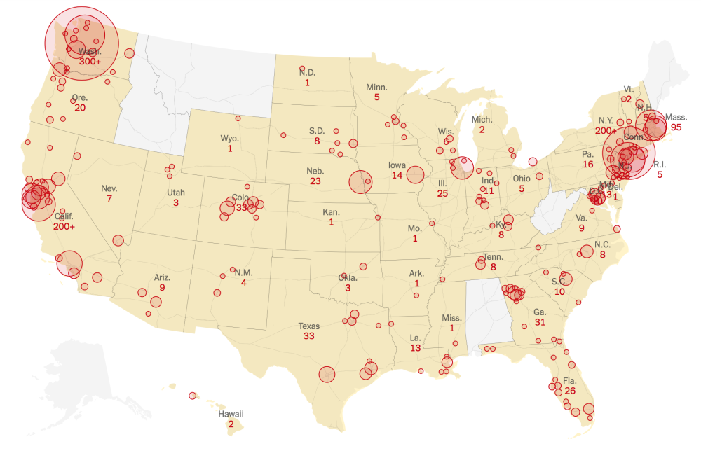 图说:美国新冠肺炎确诊人数分布。图/《纽约时报》)