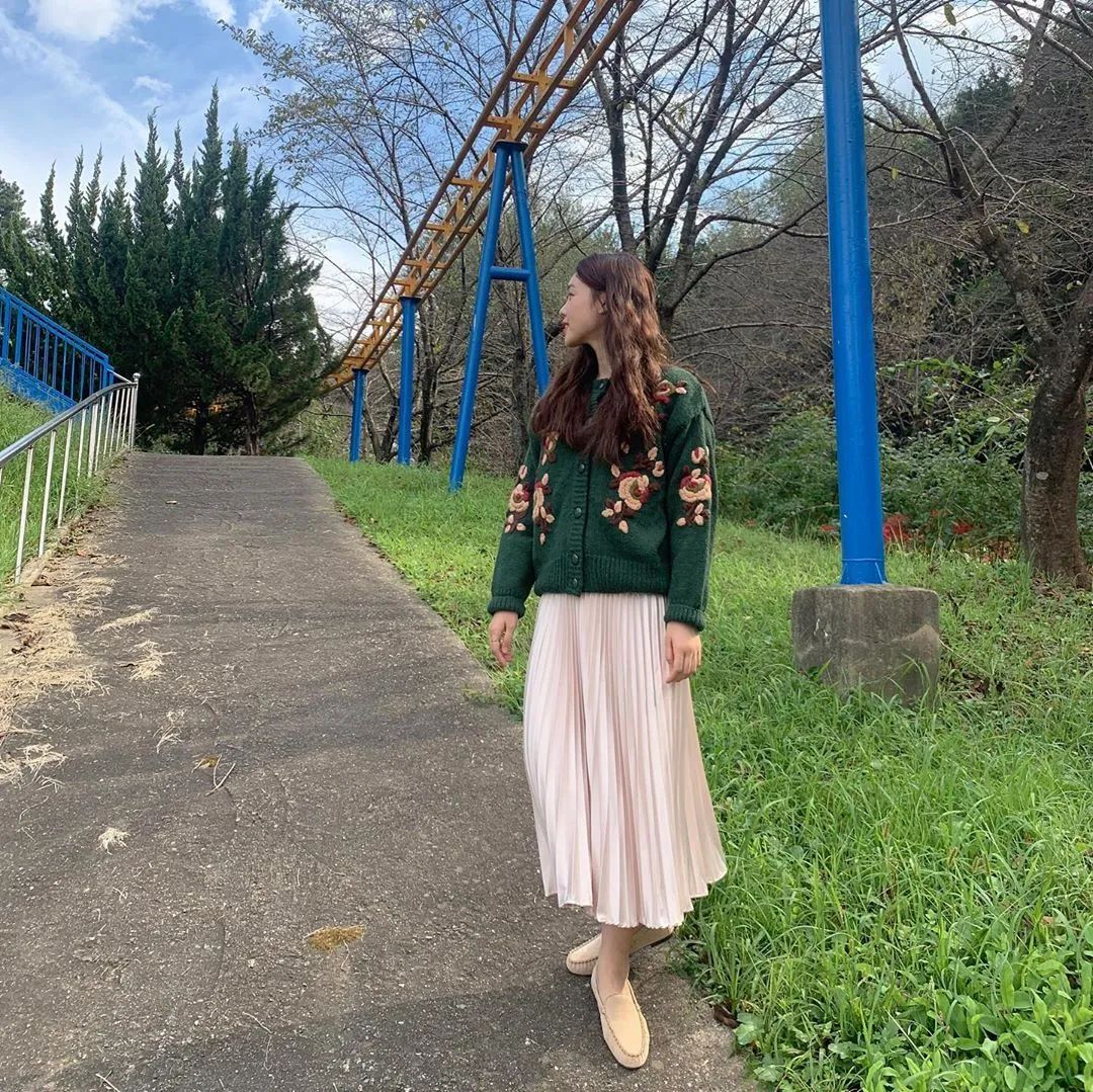 ▲y.hyein还用米色半裙搭配绿色开衫,春日神仙CP美成画!