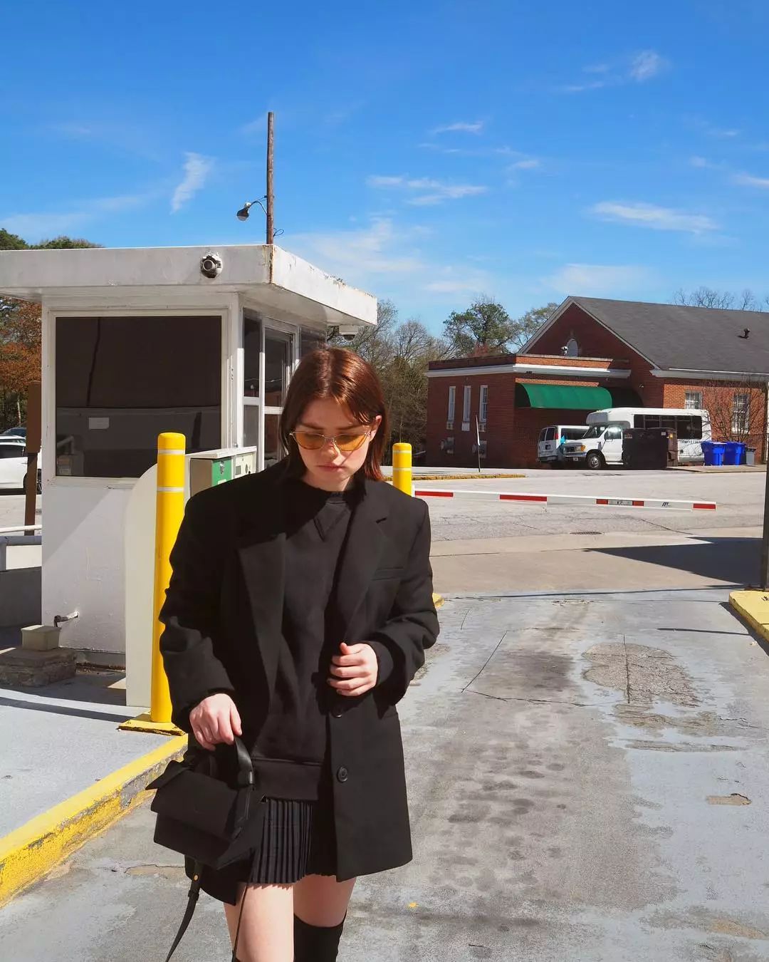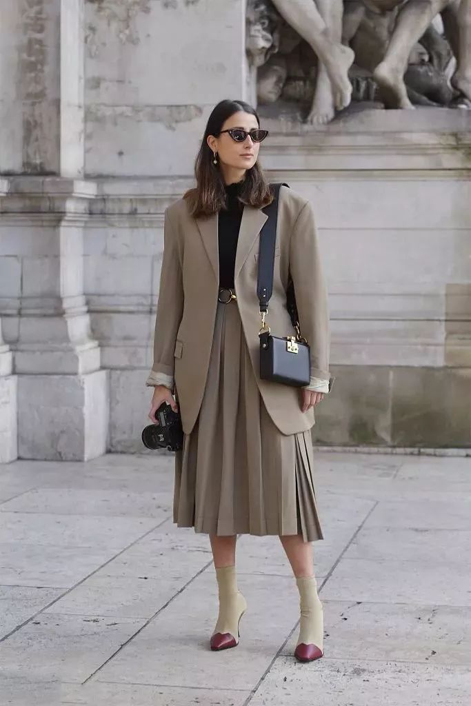 西装面料的百褶裙也超受欢迎,搭配同色西装,秒变职场女达人。尤其是大褶设计,褶皱宽度较宽,非常减龄。