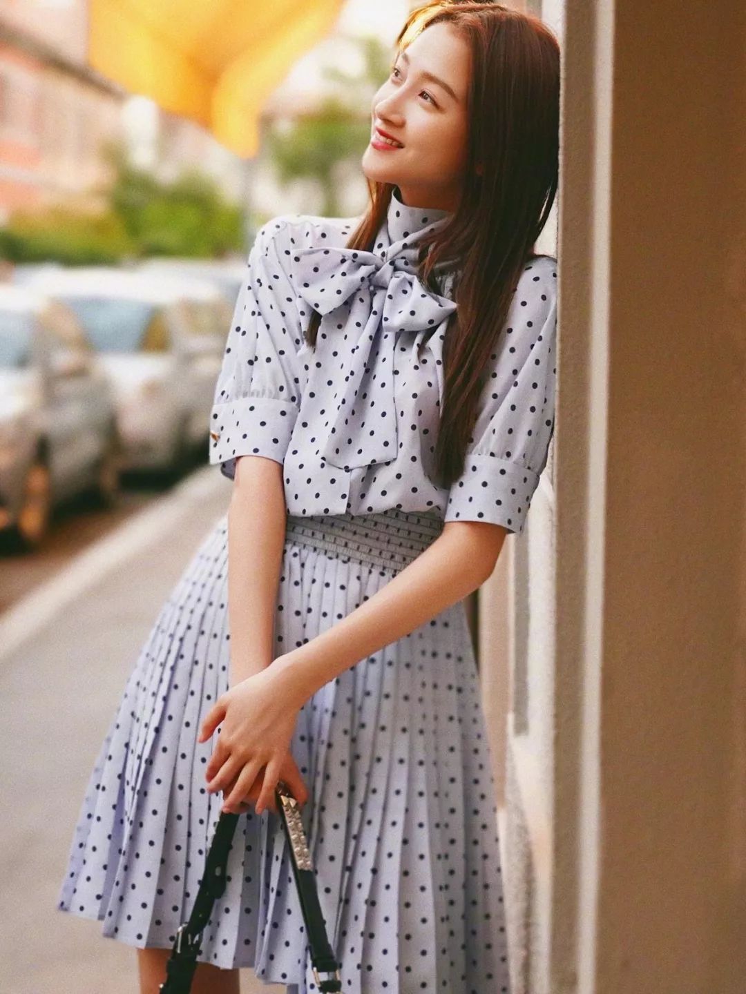 ▲晓彤这一身波点百褶裙套装是不是超文艺,小清新范儿太杀了。