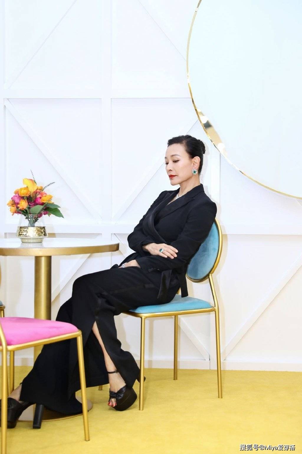 与上面的野性十足、性感又霸气的西装造型不一样,陈冲身穿的这件黑色绑带西装连体裤,更加凸显知性优雅的中年女性魅力。但是这种版型非常挑身材,因为是连体的版型,身材高挑并且匀称的女性穿更加适合,否则很容易暴露身材缺点。微胖或者线条不好看的女生,阔腿的西装裤也是很好的选择。西装的翻驳领加小V领的设计,露出一点锁骨显得脖颈更加修长,搭配不同的配饰可盐可甜随意切换。微微垫肩的设计显得人更加挺拔有精气神。
