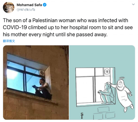 出于防疫考虑,医院谢绝了一切家属的探访,为此,她30岁的小儿子每天晚上都爬到窗户上远远地陪着母亲。