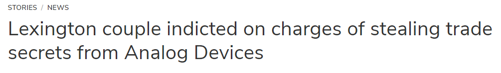 家住麻州勒星顿镇的华人余浩洋(Haoyang Yu音译)和他妻子合办的公司Tricon MMIC涉嫌盗窃麻省最大的上市公司之一、半导体公司Analog Devices (ADI)的数百份机密文件,为自己牟利,夫妻二人10月1日被正式起诉