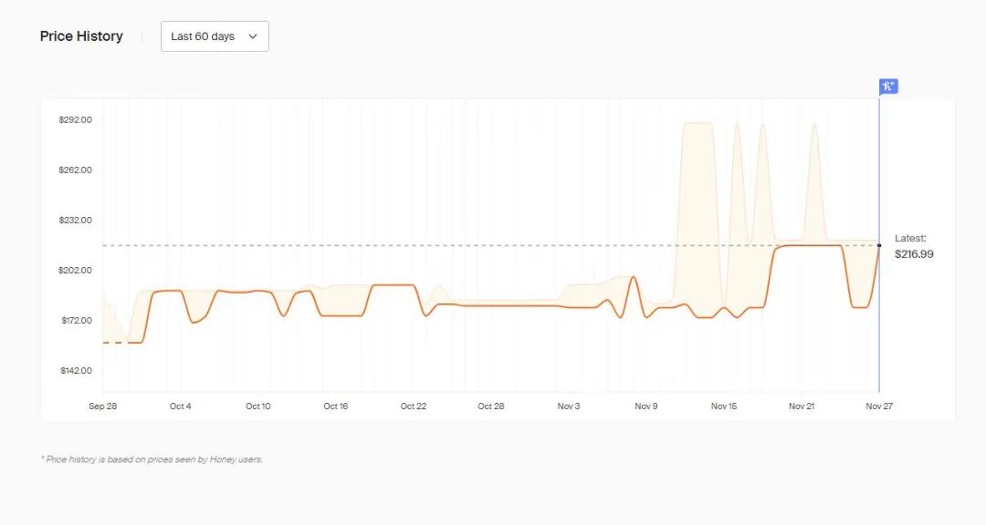 图:Honey比价可以看到,现在这款显卡的价格是60天来最高的。