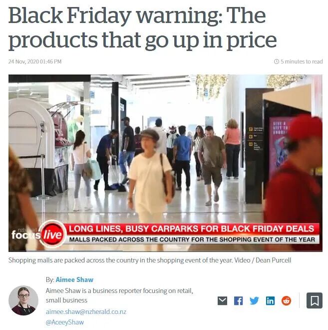另外,新西兰Nzherald网站在今年11月24日也发布了《黑五警告:商品会涨价!》的文章。文章指出:价格比较网站PriceSpy的数据显示,在黑色星期五前后,有十分之一的商品价格会上涨。这些商品通常是小玩意和电子产品,涨价通常发生在黑色星期五的前一周,以便让打折显得更有吸引力。