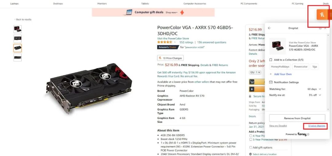 例如,安装Honey之后,就可以在亚马逊购物时比价,可以查看到孙先生想购买的显卡价格现在是过去60天内最高的价格。这时候就应该果断放弃不要购买了。