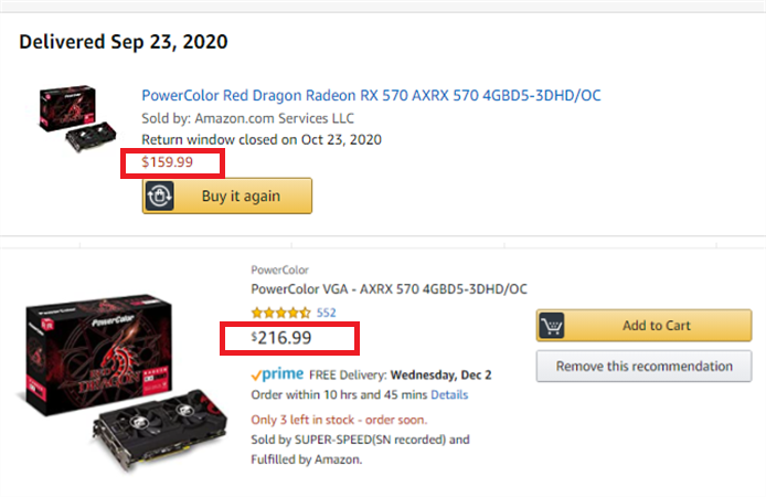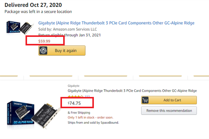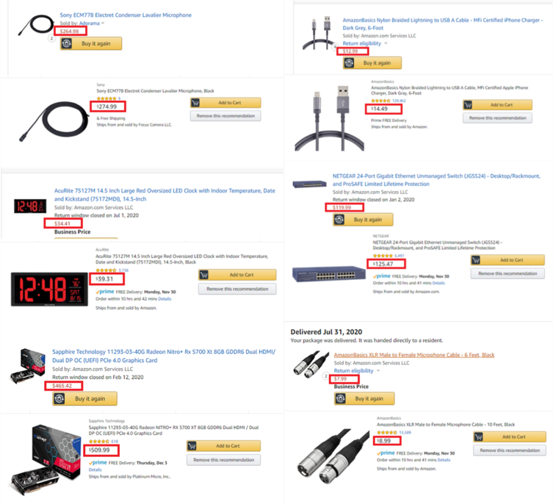 孙先生随后查询了此前购买过的商品的价格,结果发现60%左右都涨价了:9月23日到货的显卡是$159.99买到的,现在价格是$216.99,涨价35.6%;10月2日到货的无线网卡是$59.99买到的,现在价格是$74.75,涨价24.6%。