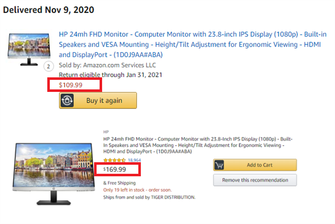 孙先生喜欢网购,主要是购买一些电子产品、摄影棚设备等,今年黑五当天他就守在网上找各种折扣。本来打算再添置一台之前买过的HP惠普显示器,结果查询后发现11月7日刚刚用$109.99买到的显示屏现在竟然涨到了$169.99,涨价50%。