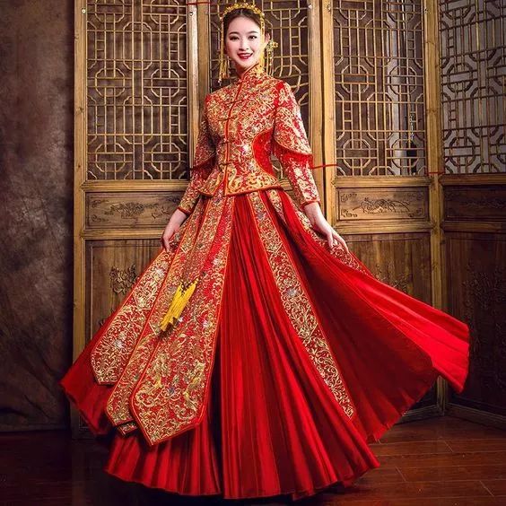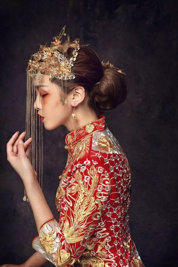 在人生最幸福的那天,如斯华丽装扮: 缨络垂旒,玉带蟒袍,着百花裥裙,穿大红绣鞋。 一抹浓艳满身喜庆,一如心中幸福满溢,又何止美哉!