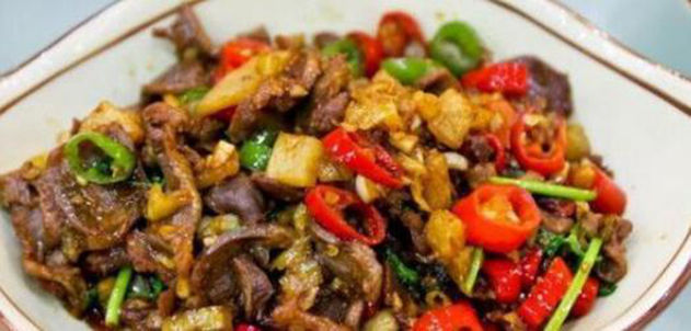 3、锅中倒入油,下入豆瓣酱炒炒出红油,下入姜、蒜、泡椒炒香,下入鸡杂炒断生。加点料酒翻炒一会,下入芹菜炒断生,最后加点糖、盐即可。