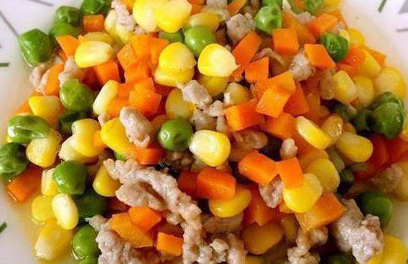 食材:豌豆、胡萝卜、玉米、肉馅、酱油、盐、大蒜、料酒、生抽