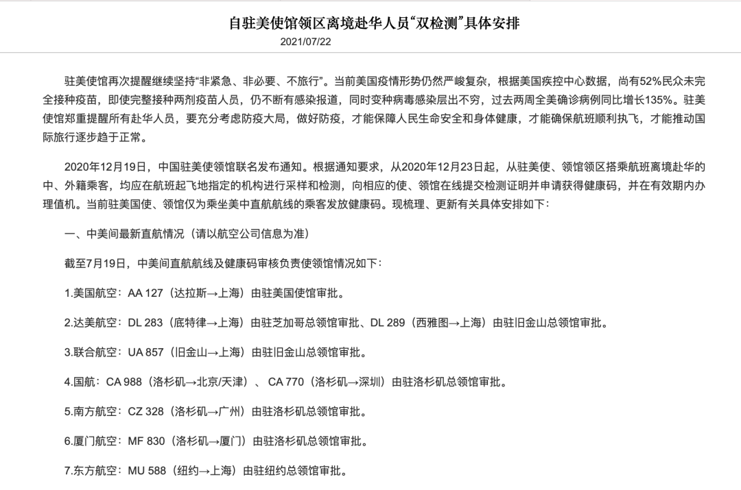 7月22日,中国驻美大使馆发布通知,称从驻美使、领馆领区搭乘航班离境赴华的中、外籍乘客,均应在航班起飞地指定的机构进行采样和检测,向相应的使、领馆在线提交检测证明并申请获得健康码,并在有效期内办理值机。
