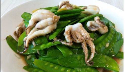 材料:八爪鱼500克、荷兰豆250克、花生油2汤匙、食盐3克、生抽2茶匙、生姜1小块、料酒1茶匙、鱼露1茶匙大蒜3瓣