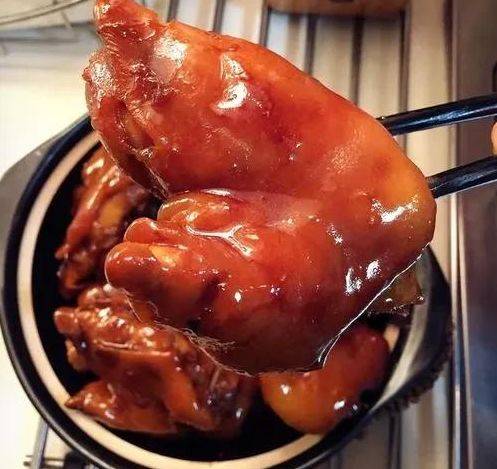 5、加老抽(今天加了红烧酱油),冰糖。煮开后转小火,盖锅盖转小火继续焖煮,煮至猪蹄上色、酥烂,(约1小时不到)最后大火收汁