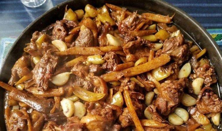 2、把蒜头倒进去爆香,接着把鸭肉块倒进去翻炒出金黄诱人的鸭油。