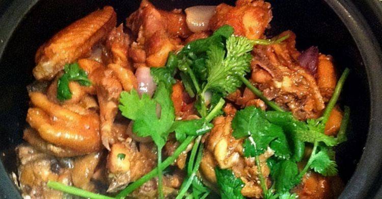 6.然后把煮开的鸡块倒入煲仔中,继续焖煮约15分钟,收汁,最后撒点葱花即可