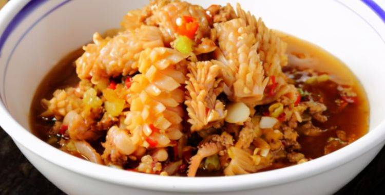 食材:鲜鱿鱼200克、酸萝卜粒30克、蒜薹粒20克、小米辣圈10克、姜米、蒜米、辣鲜露、美极鲜酱油、生抽、鲜露、一品鲜酱油、陈醋、香油