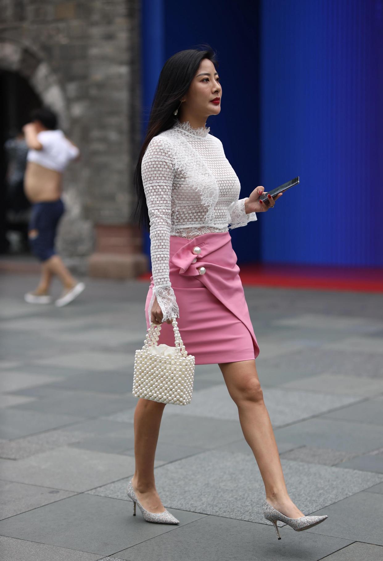 小姐姐选择了一身米色的包臀裙套装,属于浅色调的米色能带给人干净又温柔的感觉,特别适合成熟的女人。上身一件简约风的米色T恤,下面搭配一条同样颜色的包臀裙,纯色的套装也很有时尚感。T恤选择了小圆领的紧身版型,并且袖子特别短,仅仅能够遮盖住肩部,这样显得双臂更有线条感。