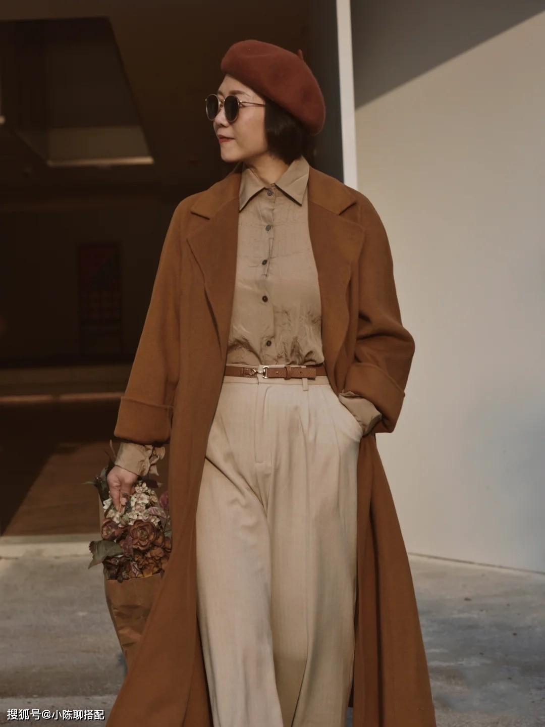 再搭上一件有质感的长款大衣,露出百褶裙一部分轻盈地下摆,裙摆流转间,婉约动人。