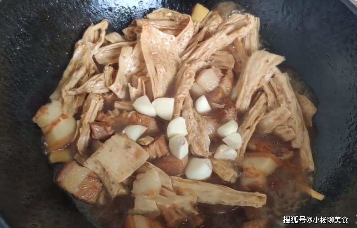 4、加入姜蒜继续煸炒,不断翻炒爆出香味,然后加入适量生抽、少许老抽,翻炒均匀给五花肉上色,然后倒入适量的开水刚好没过五花肉,然后开始调味,加入适量盐、白糖,再加入适量料酒去腥,以及香料:桂皮、八角、香叶、干辣椒,搅拌均匀后开大火烧开,汤汁烧开后盖上锅盖,转小火焖煮20分钟,20分钟后,打开锅盖将香料夹出来不要,然后下入泡发好的腐竹和一些蒜粒,搅拌均匀后再盖上锅盖继续焖煮10分钟;