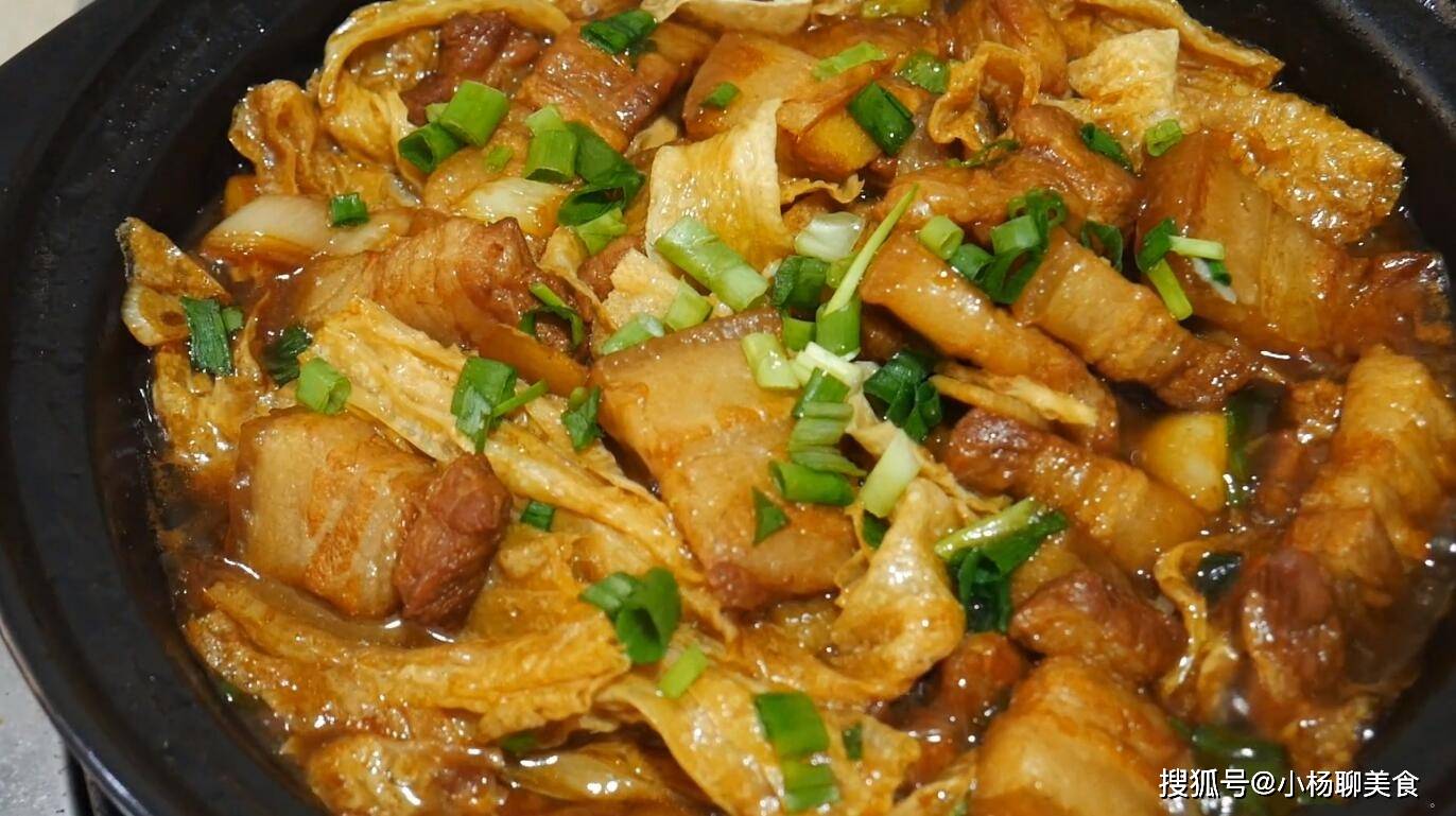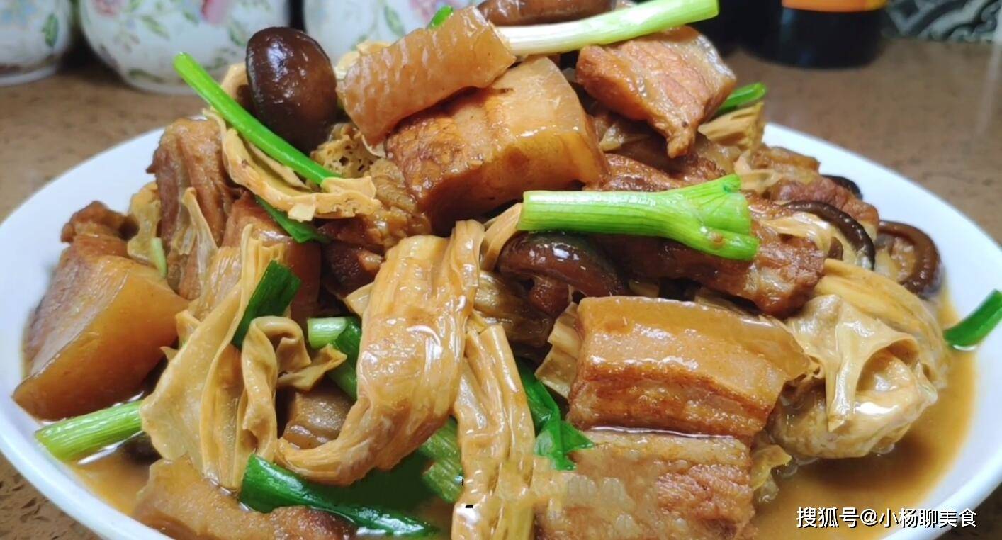 5、,10分钟后转大火收一下汤汁,待汤汁收至浓稠后下入切好的葱段,翻炒均匀后就可以关火出锅了,盛入盘中,这道家常版五花肉焖腐竹就做好了,肉香浓郁,腐竹充分吸收了五花肉的鲜味,特别好吃,五花肉肥而不腻,非常下饭。