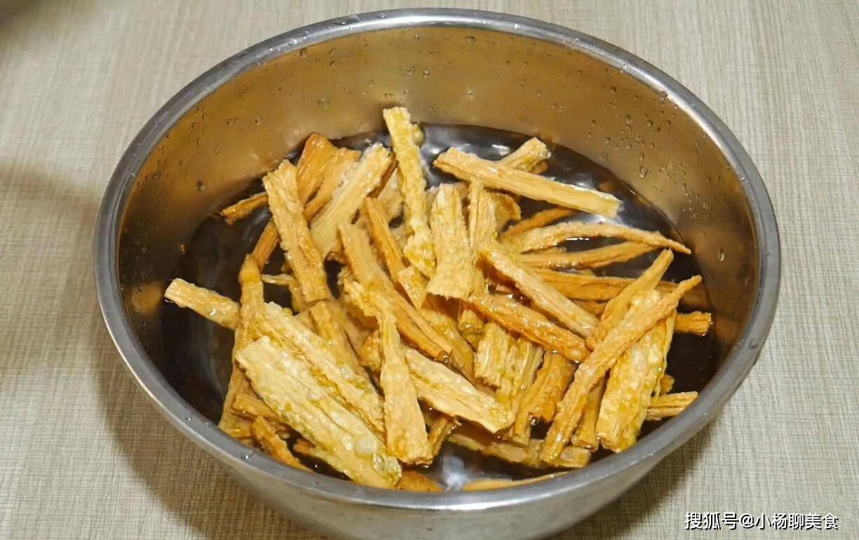 2、起锅,锅中倒入足量食用油,油温5成热的时候下入剪好的腐竹块,开小火慢慢炸制,期间不断翻动腐竹让其受热均匀,待腐竹炸至金黄酥脆表面起泡的时候,控油捞出放入清水中浸泡一会儿,将腐竹泡软备用;另外提前煮一壶开水备用;
