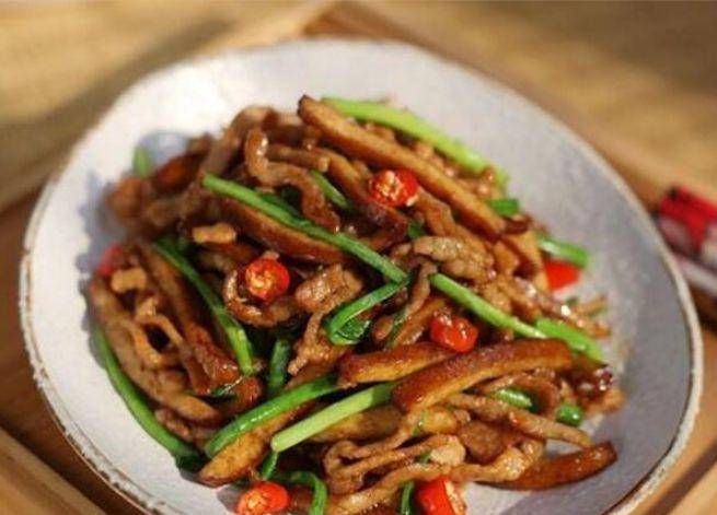 1、腊里脊肉用水泡1小时,上笼蒸熟,晾凉,切薄片。青尖椒洗净,斜刀改段。油锅烧至四成热,放入豆腐干炸至外皮硬,捞出,晾凉,切条。