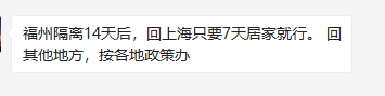 关于隔离政策,FlyChina负责人表示,目前旅客入境福州后需要隔离14天后,再回上海只要7天居家隔离即可。但如果回其他地方,需要按照当地政策进行调整。